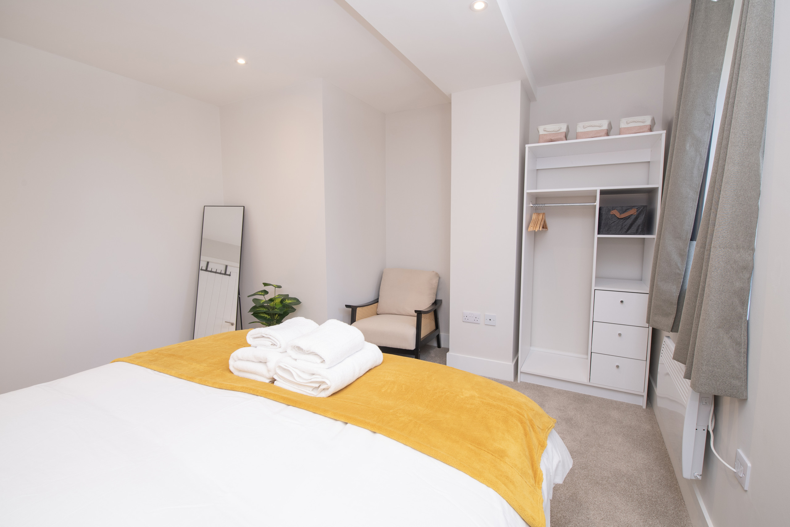 The apartment features a stylish one king-size bed, thoughtfully designed with a comfortable bed and quality linen, perfect for relaxing after a day in the city. Fresh bedding, soft pillows, and storage space are provided to ensure a restful stay.