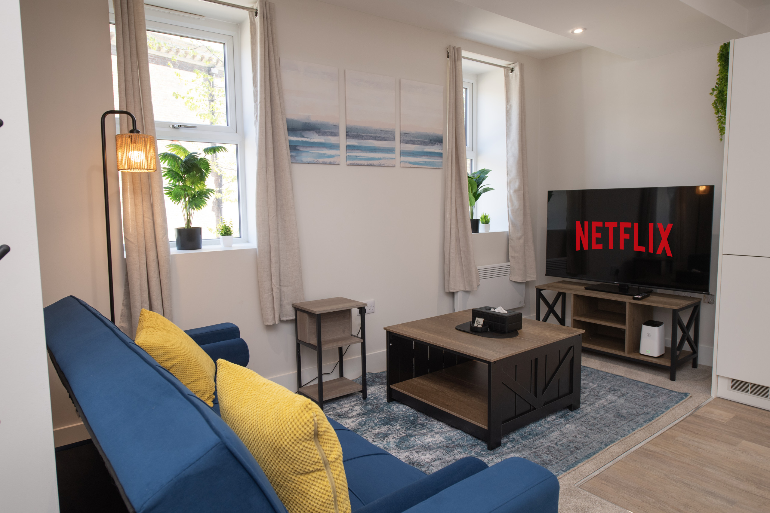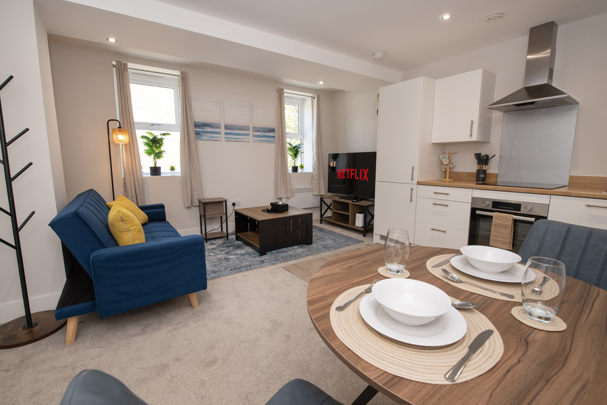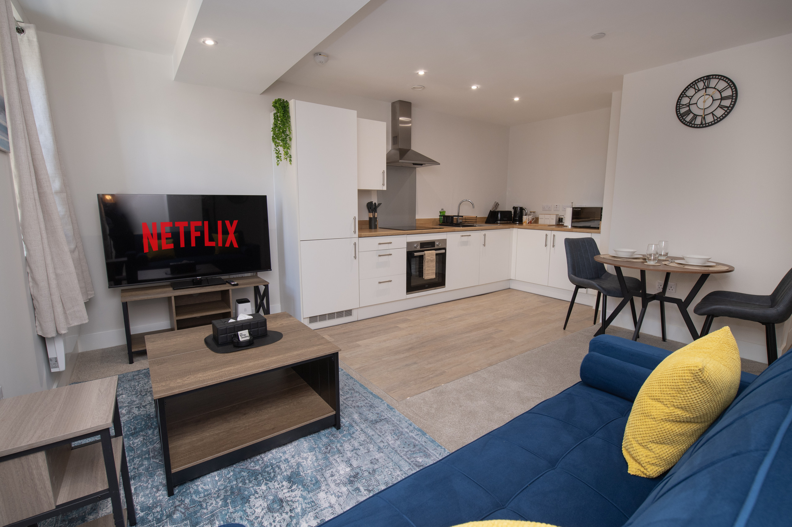 Relax in the open-plan living space featuring a comfortable sofa and smart TV, ideal for unwinding after a day exploring Hull. A dining table is also available for meals or working.