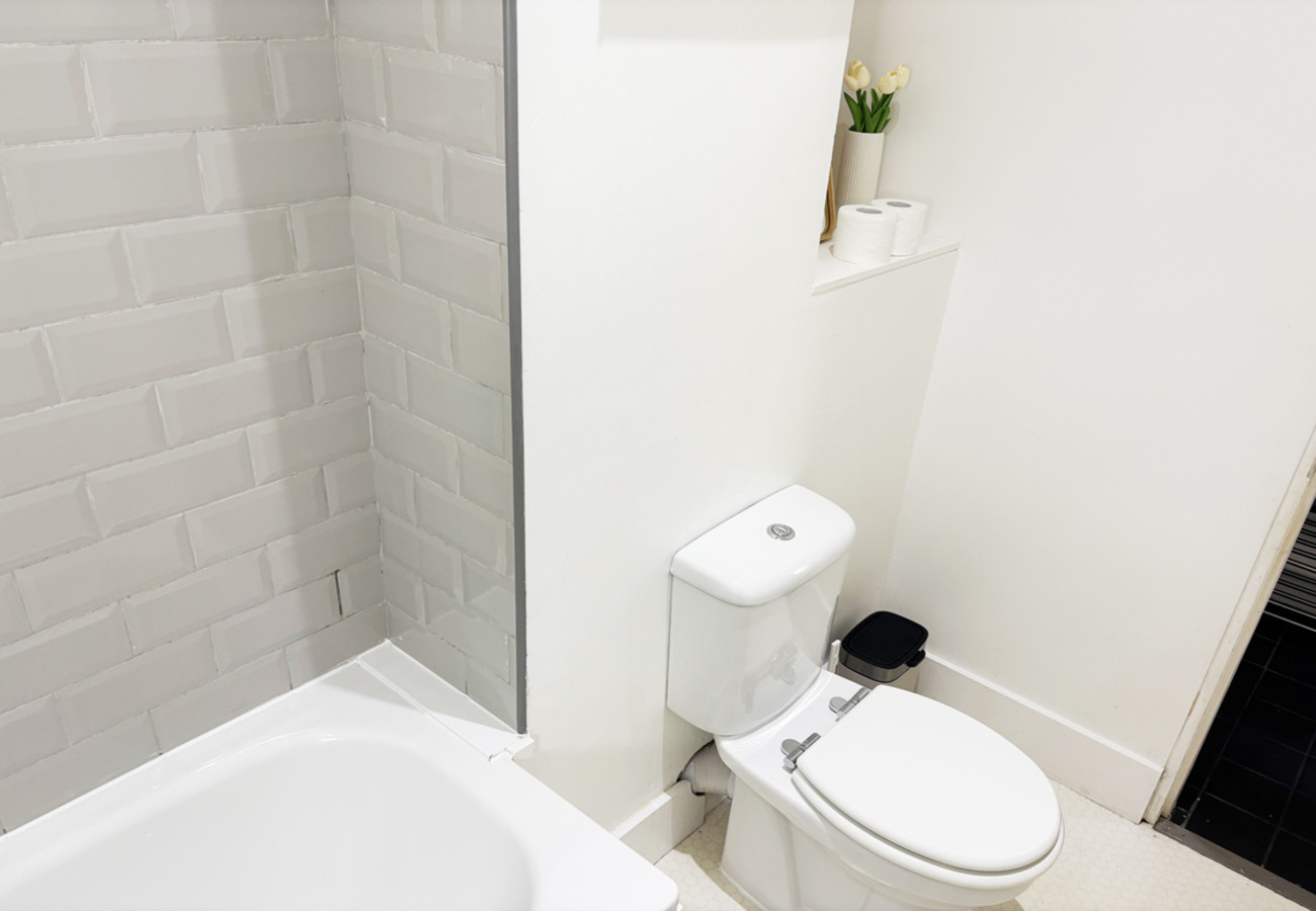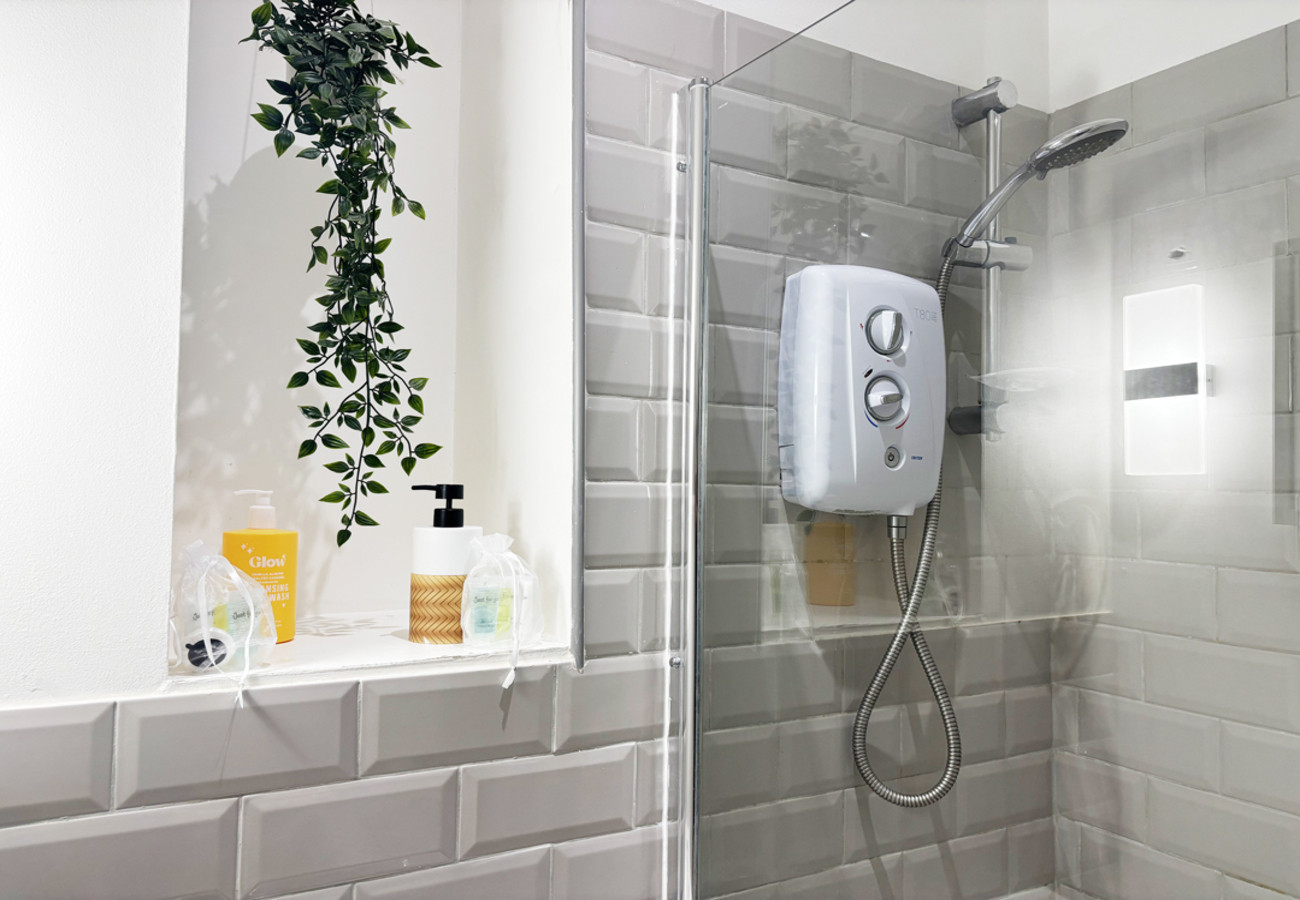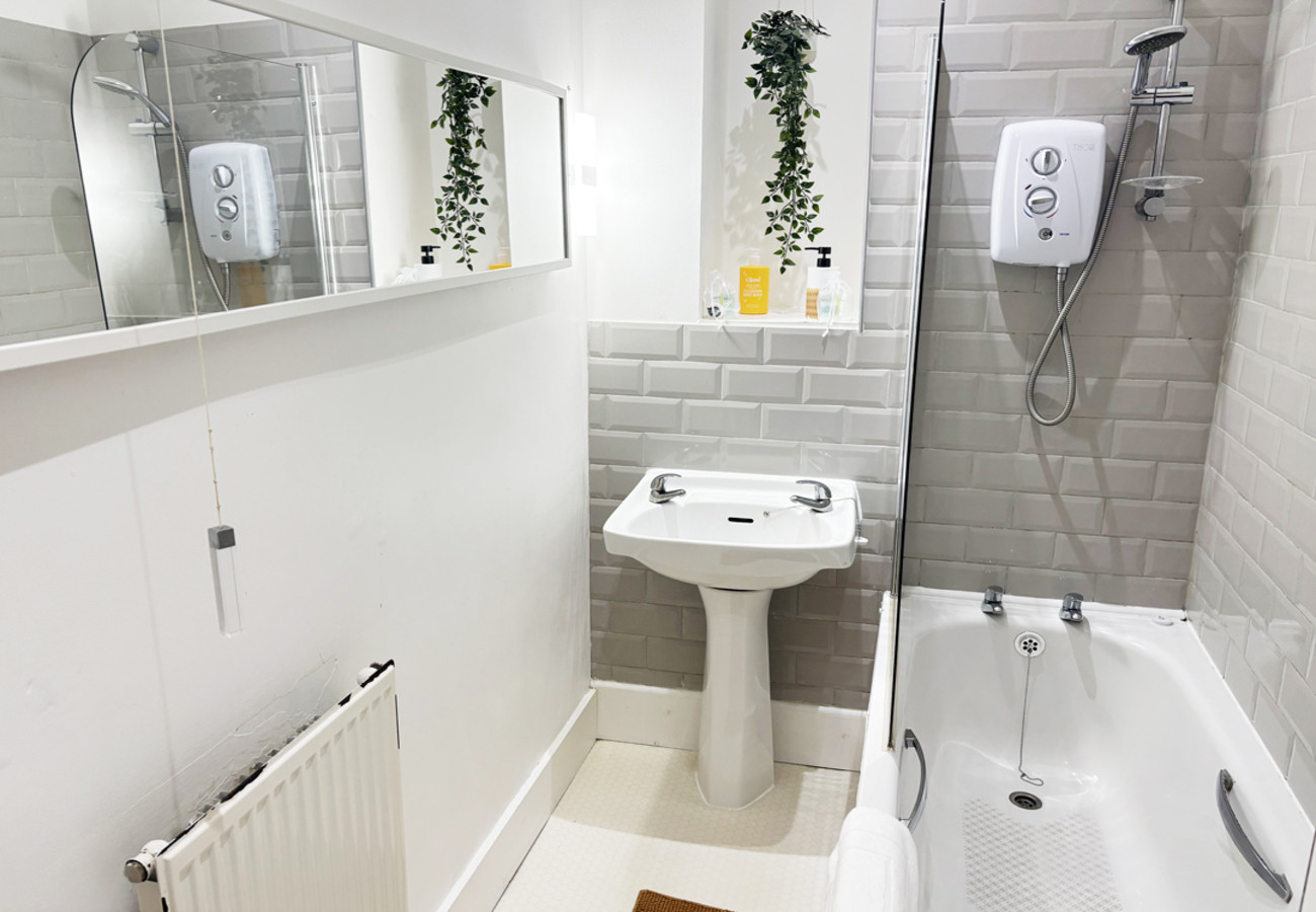 A compact and functional bathroom with a refreshing shower – perfect for getting ready before a match or unwinding after exploring Liverpool’s attractions.