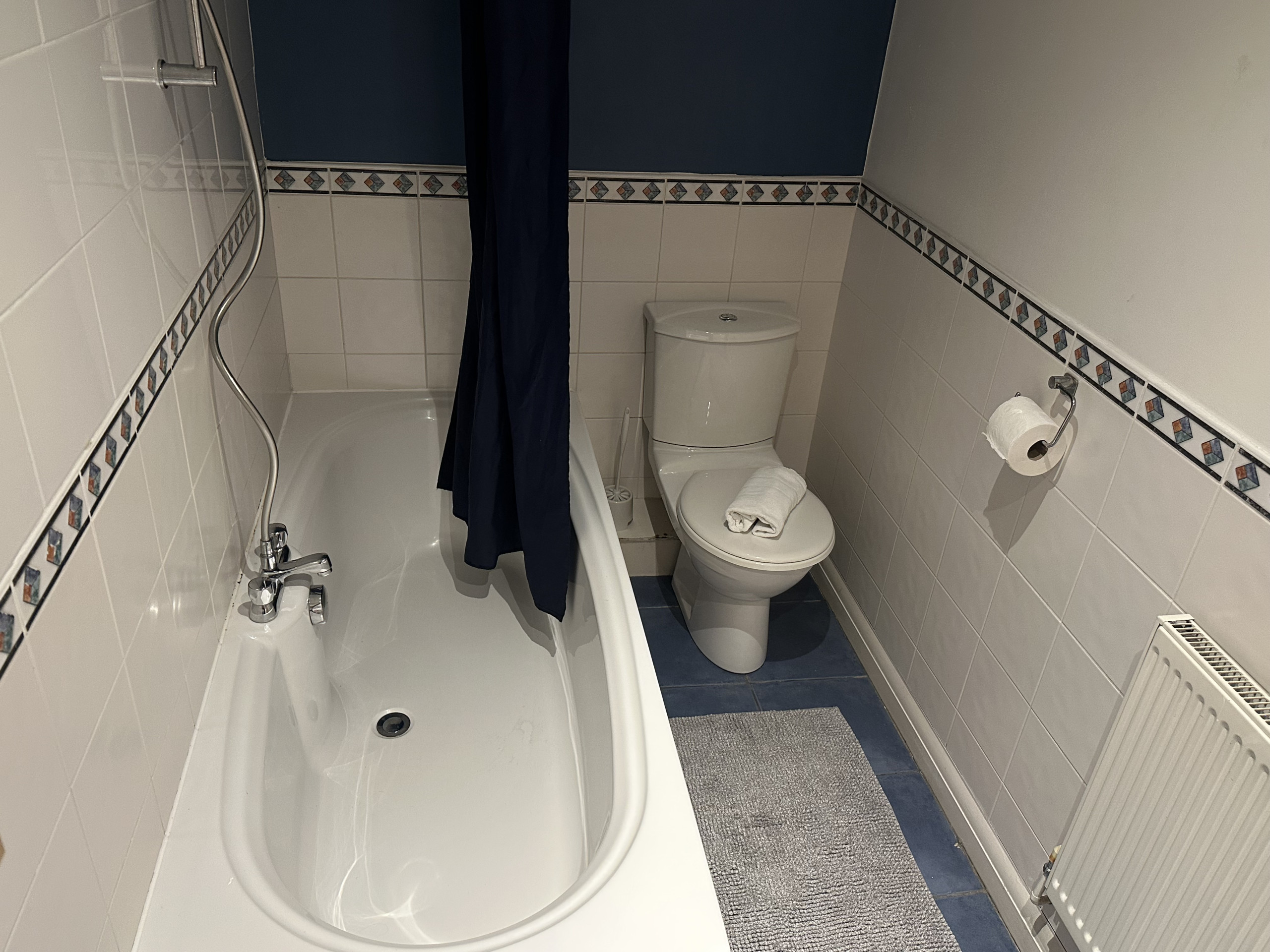 There is a modern and spacious bathroom at home, with a large full-sized bath with a shower on top, which is ideal for running yourself a relaxing bubble bath after a long day. White fluffy towels and a starter pack of toiletries are waiting for you to slip into a bubble bath (maybe with a drink in hand!).