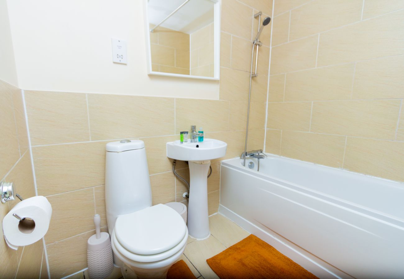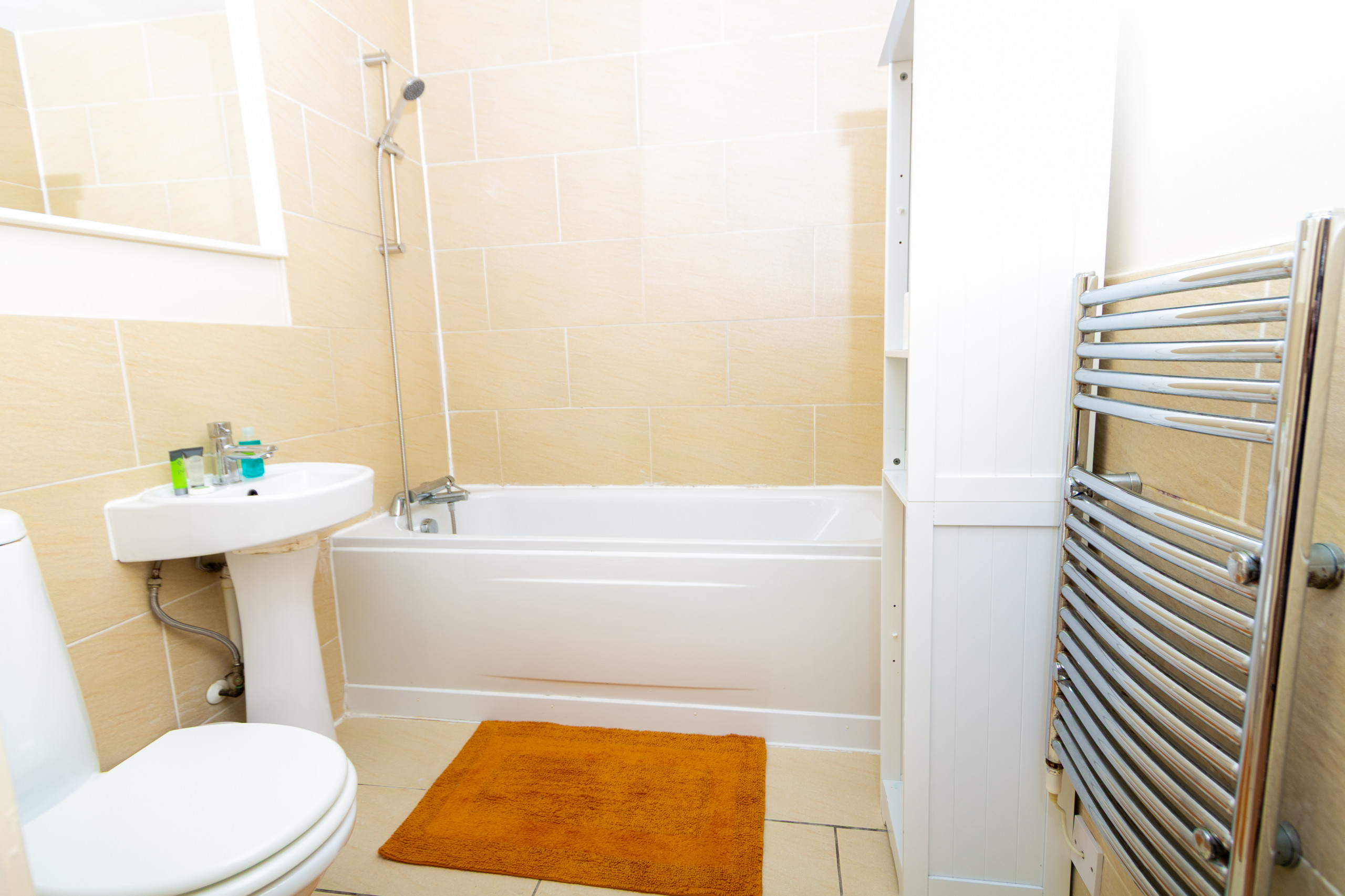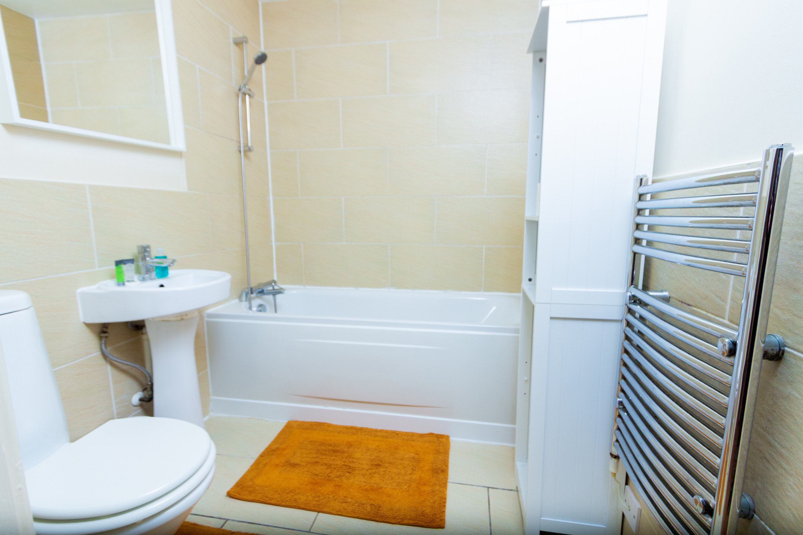 There is a modern and spacious bathroom at home, with a large full-sized bath with a shower on top, which is ideal for running yourself a relaxing bubble bath after a long day. White fluffy towels and a starter pack of toiletries are waiting for you to slip into a bubble bath (maybe with a drink in hand!).