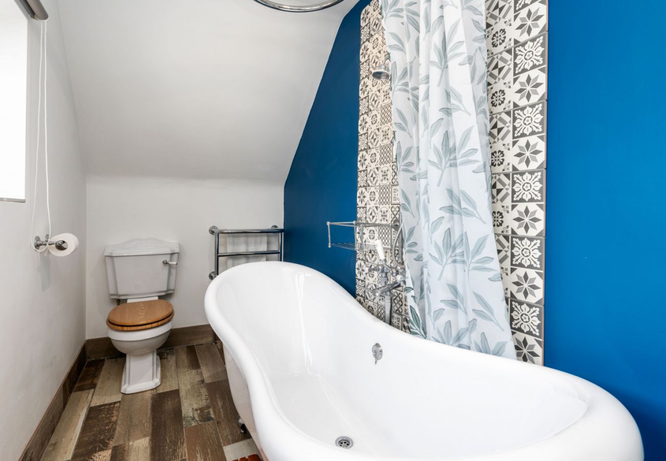 A charming bathroom with a shower over a large, vintage ball and claw bath—ideal for long soaks or a quick rinse.