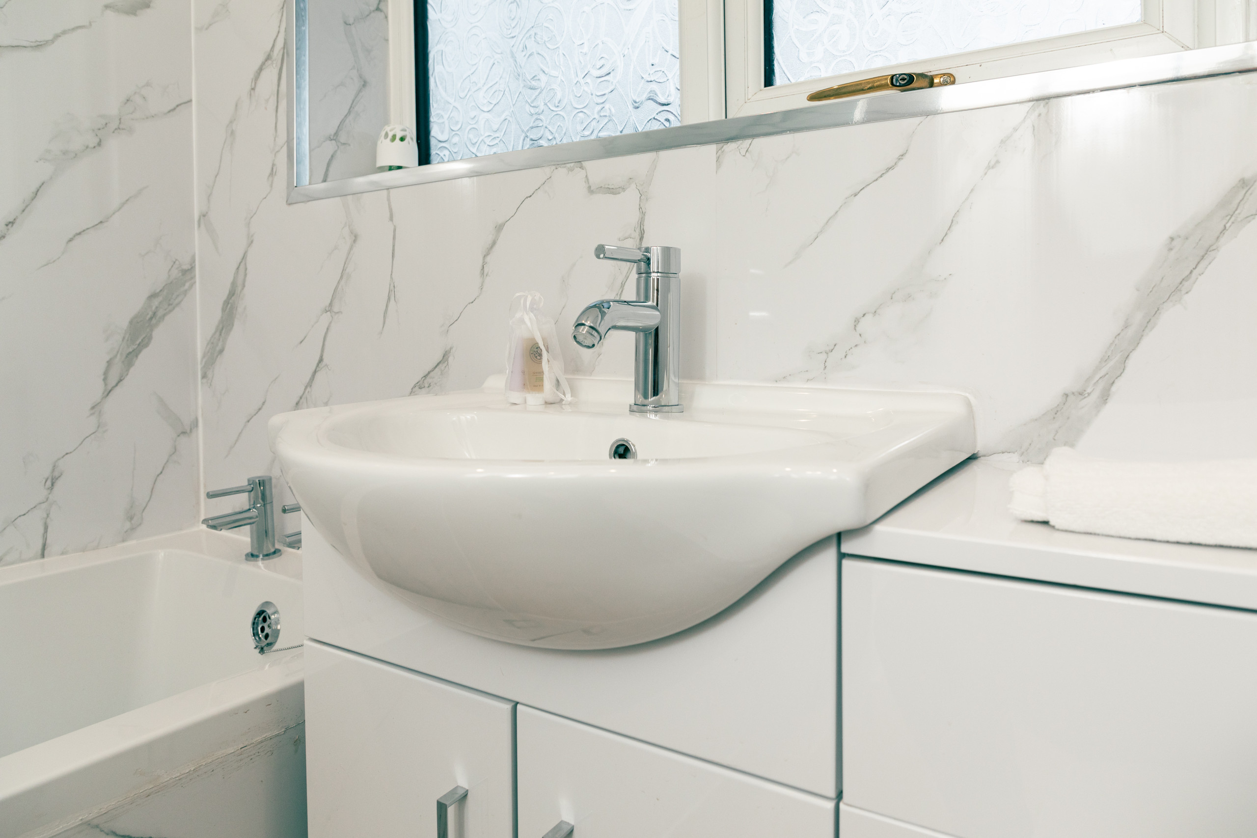 There is a modern and spacious bathroom at home, with a large full-sized bath with a shower on top, which is ideal for running yourself a relaxing bubble bath after a long day. White fluffy towels and a starter pack of toiletries await you to slip into a bubble bath (maybe with a drink in hand!). 🛀