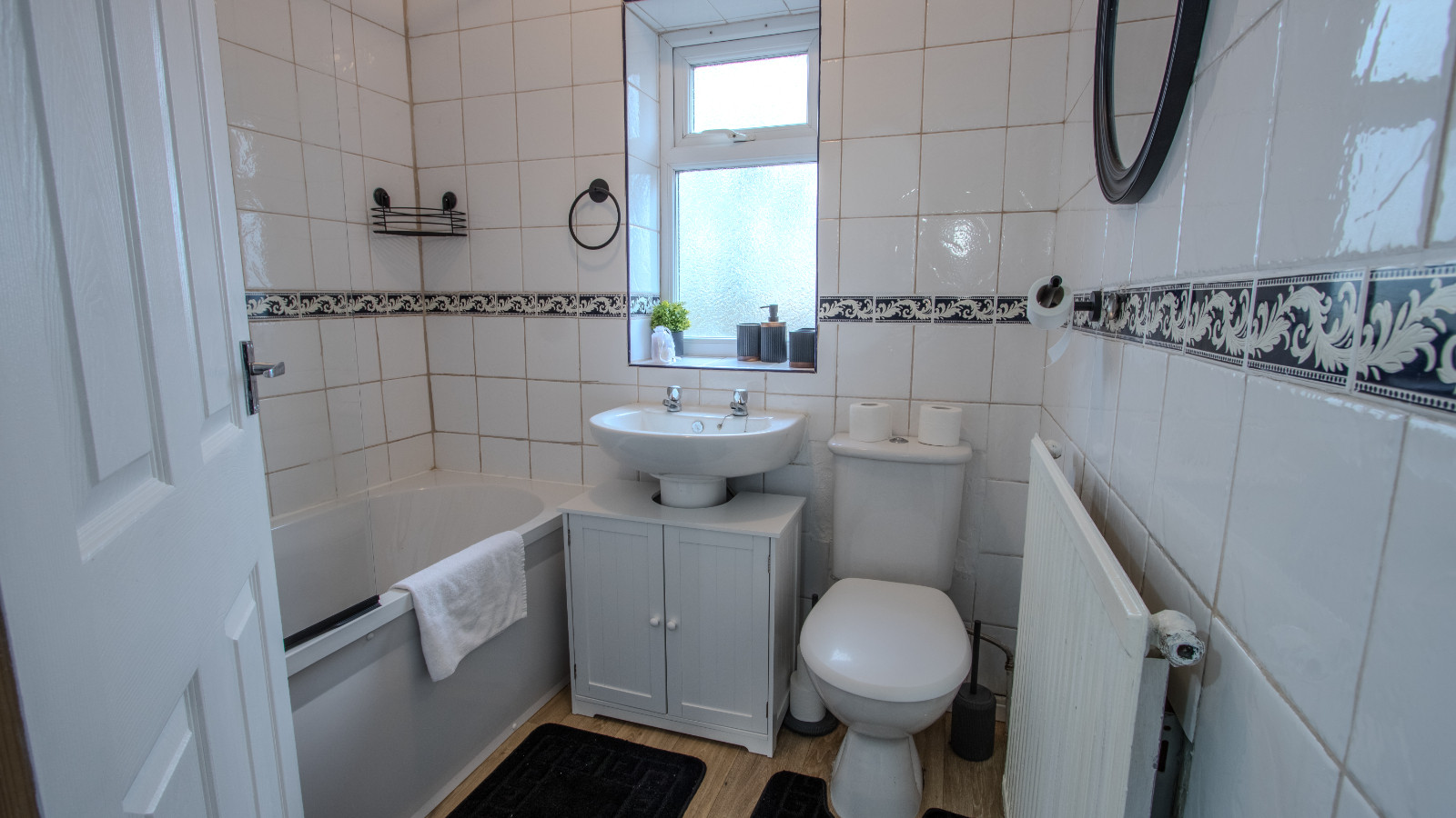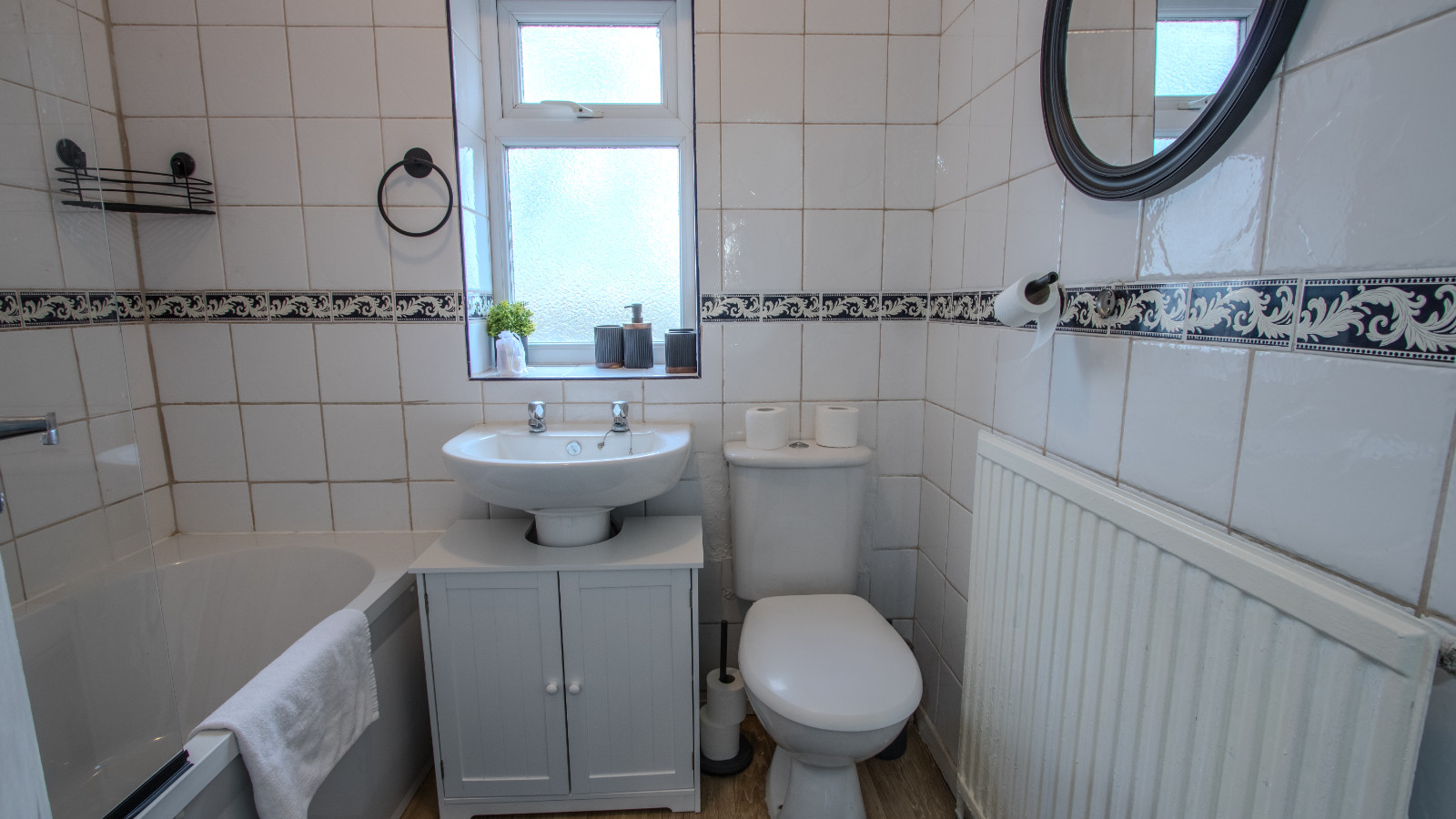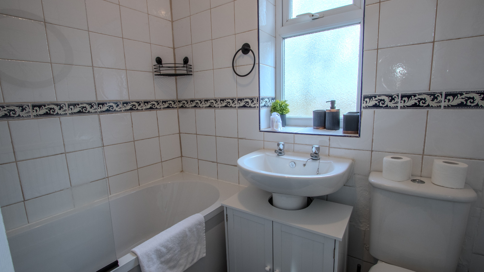 There is a modern and spacious bathroom at home, with a large full-sized bath with a shower on top, which is ideal for running yourself a relaxing bubble bath after a long day. White fluffy towels and a starter pack of toiletries await you to slip into a bubble bath (maybe with a drink in hand!). 🛀