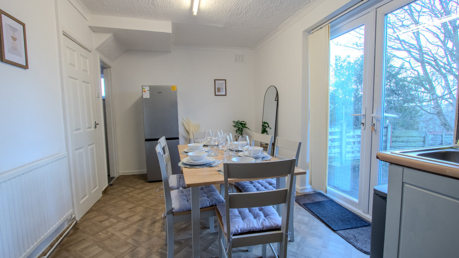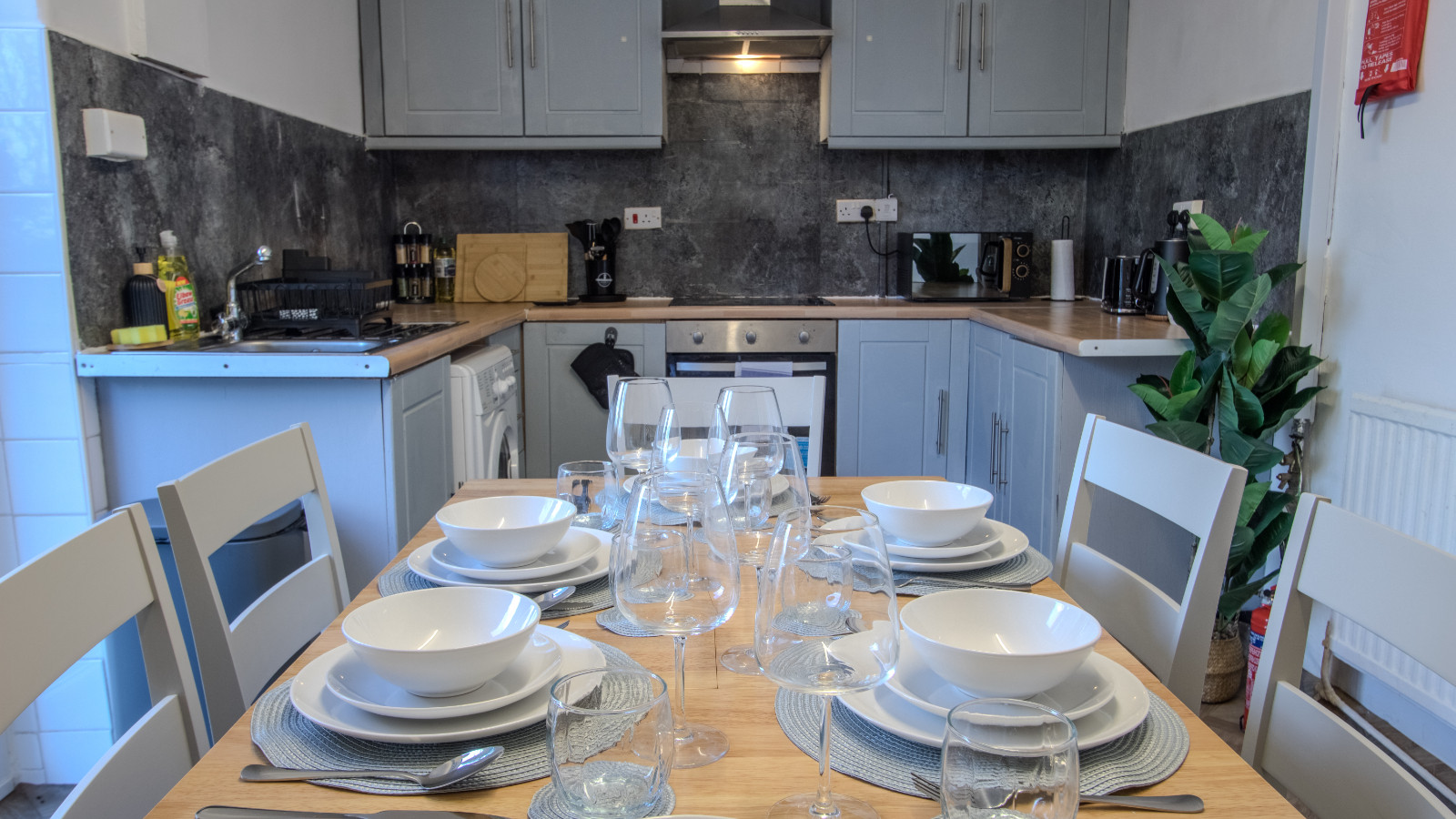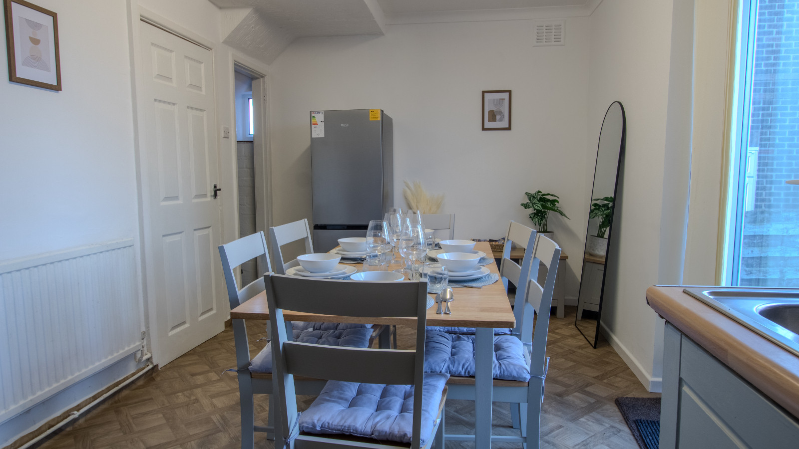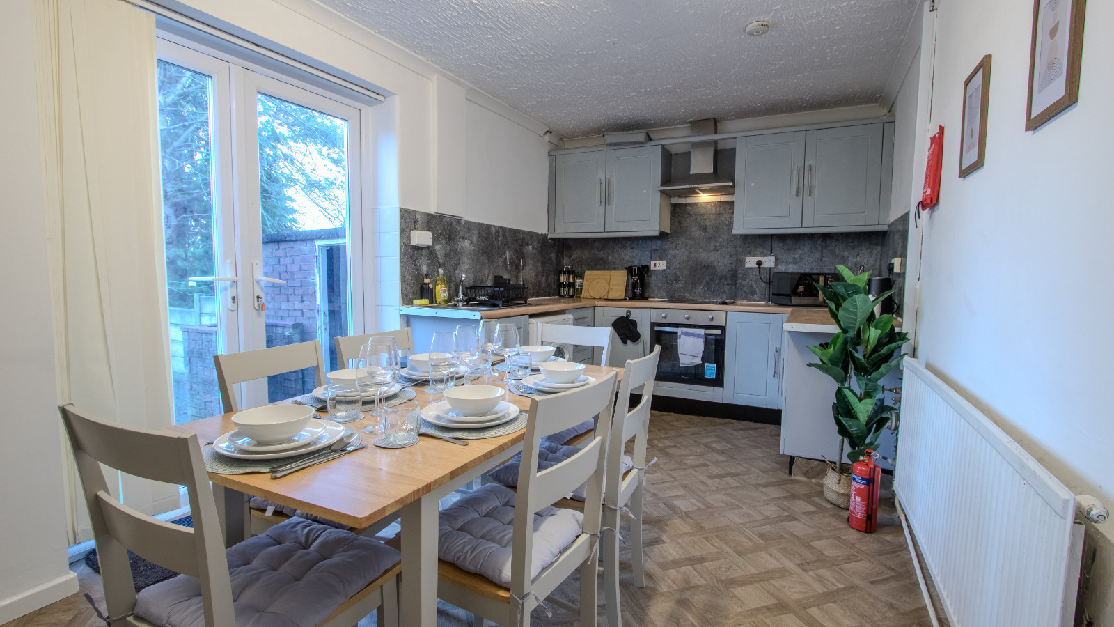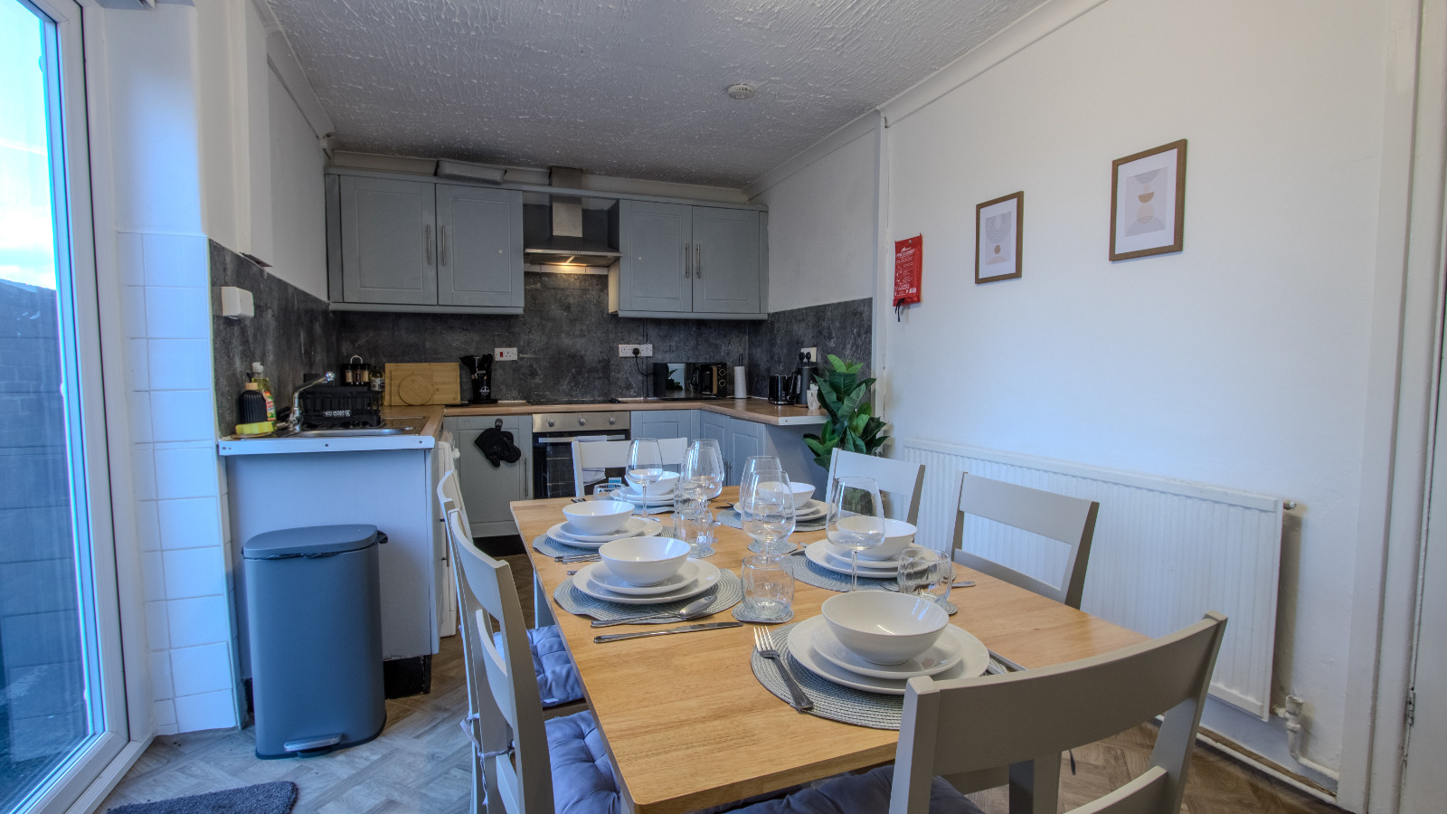 Large family kitchen and dining room perfect for meals together. 🤤Prepare your favourite meals or explore the diverse culinary scene that Manchester has to offer. There will be some basic cleaning supplies and bin bags to get you started.