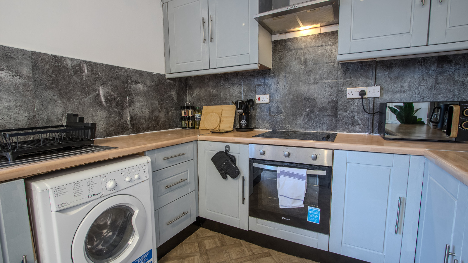 The well-appointed kitchen features modern appliances and ample storage space. Whether you're a culinary enthusiast or prefer quick meals, our kitchen caters to all your needs. There is a large table where you can dine with friends and family and enjoy your freshly cooked meals. There will be also some basic cleaning supplies and bin bags to get you started.
